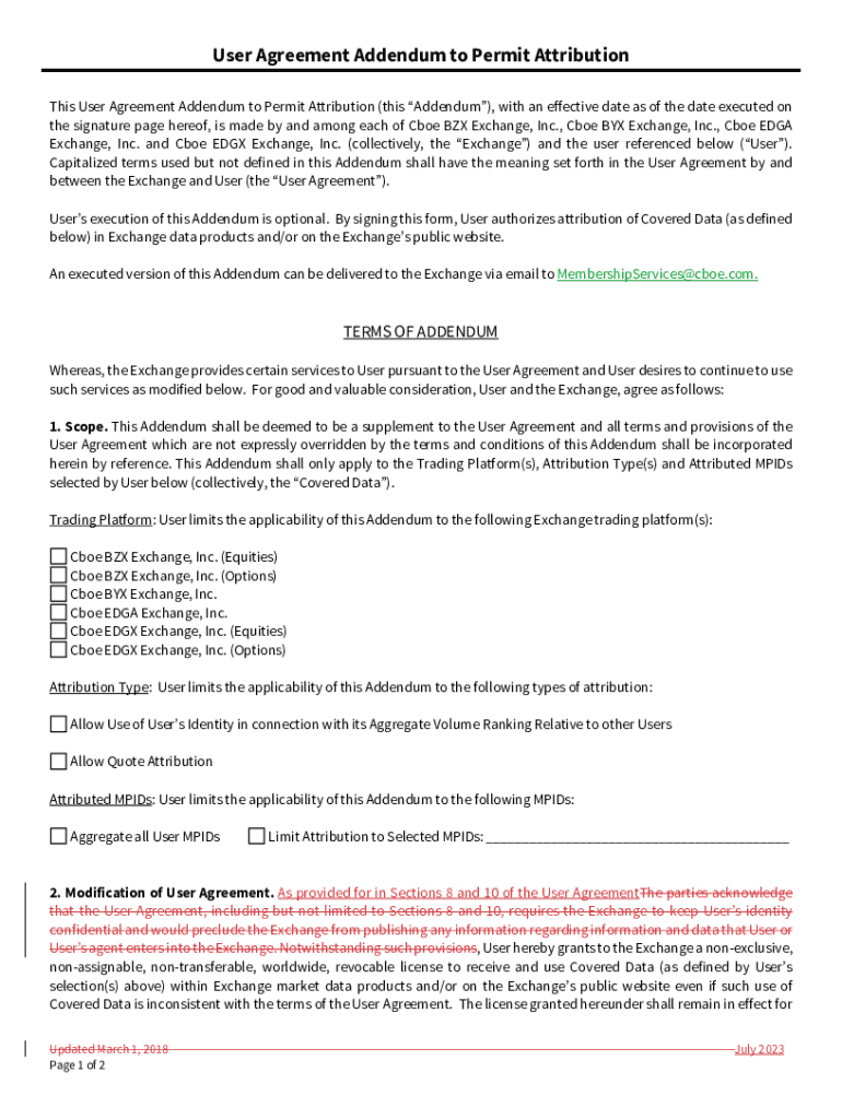 This Addendum is a supplement to the User Agreement between the Exchange and the User, granting authorization for attribution of Covered Data in Exchange data products or on the Exchange\'s public