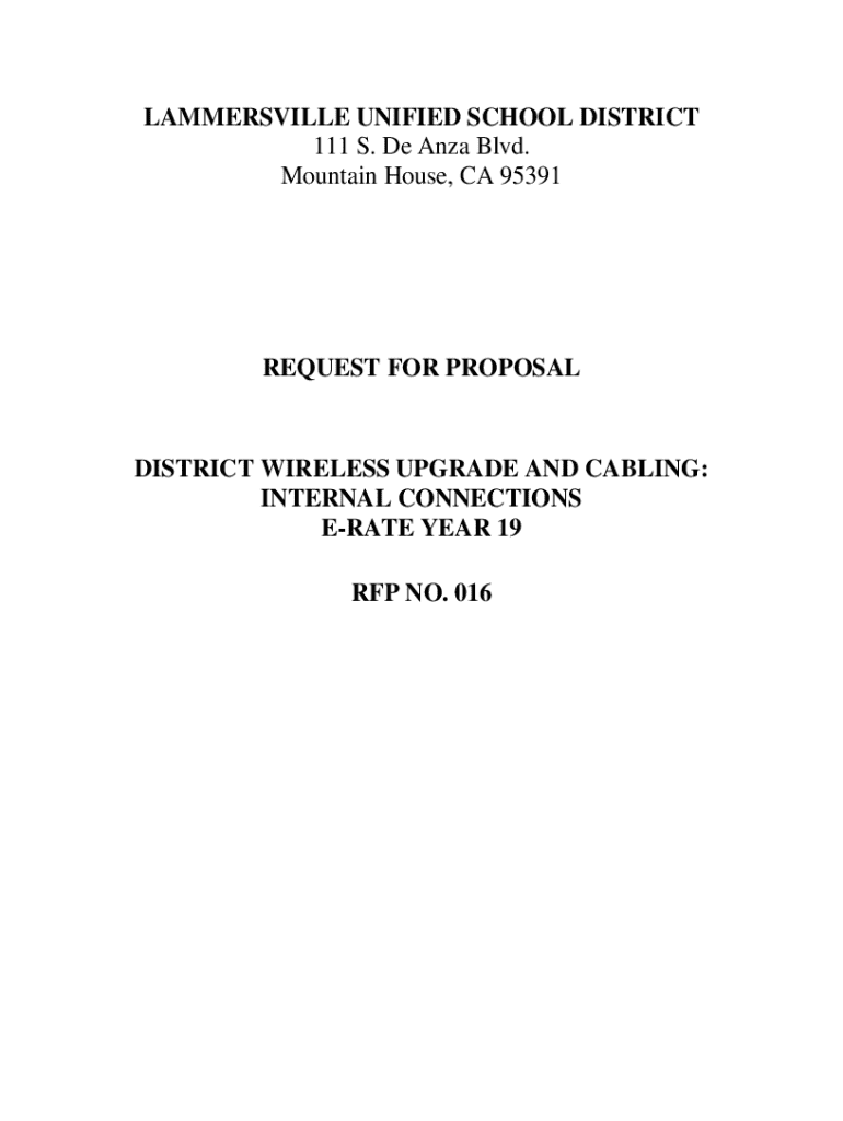 This Request for Proposal is issued by the Lammersville Unified School District to solicit proposals from qualified vendors for the upgrade of wireless and cabling infrastructure across multiple school
