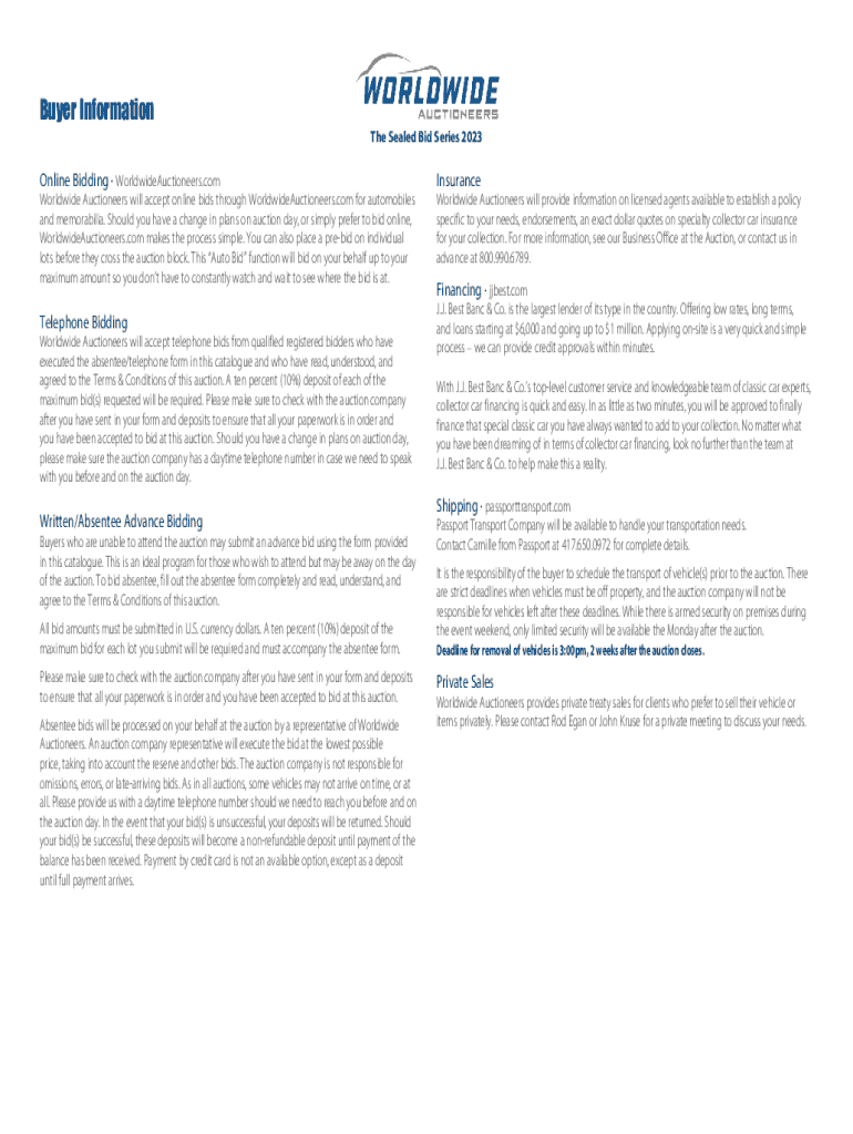This document provides essential information regarding the online bidding process for the Sealed Bid Series 2023 auction, including guidelines for online, telephone, and absentee bidding, as well