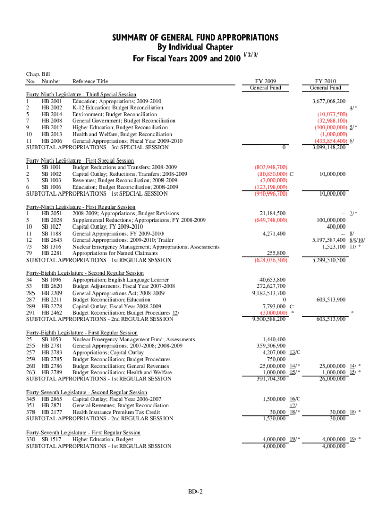 SUMMARY OF GENERAL FUND APPROPRIATIONS By Individual Chapter For Fiscal Years 2009 and 2010 1/ 2/ 3/ Chap. Bill No. NumberReference TitleFY 2009 General FundFortyNinth Legislature Third Special Session