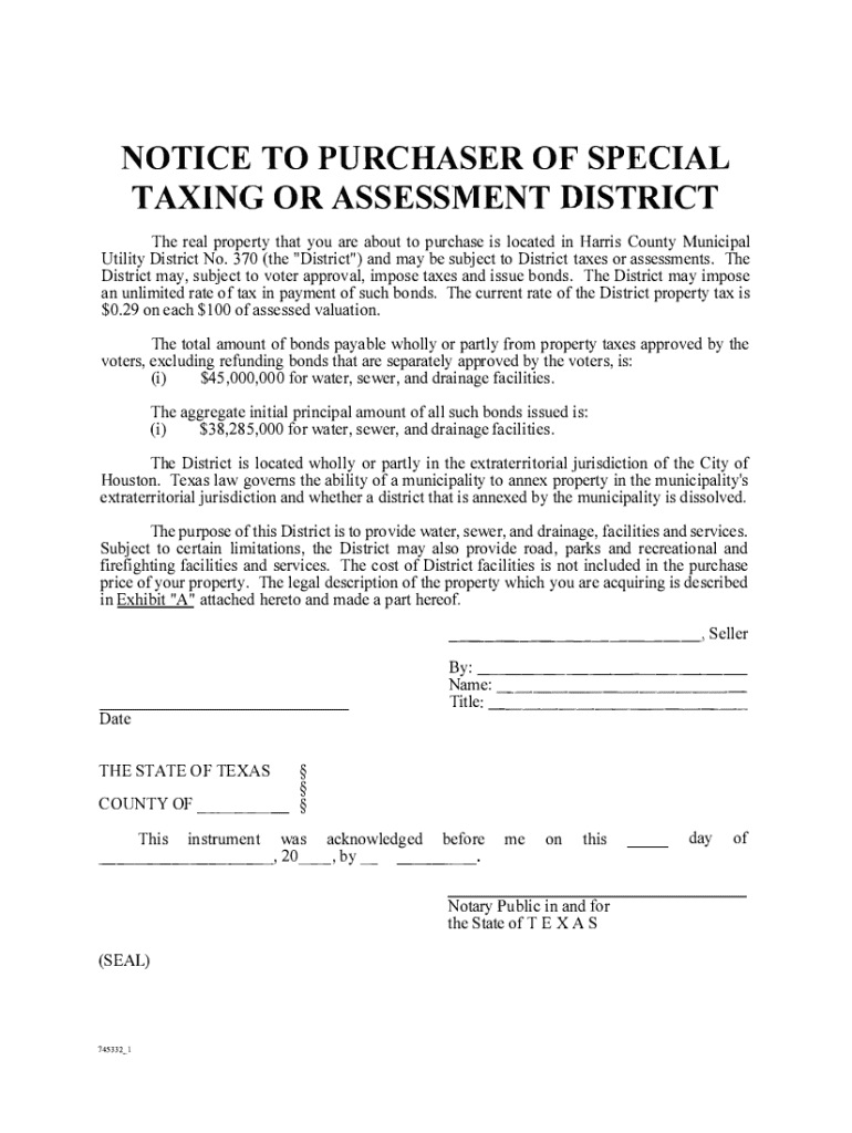 Get the free Notice to Purchaser of Special Taxing or Assessment District