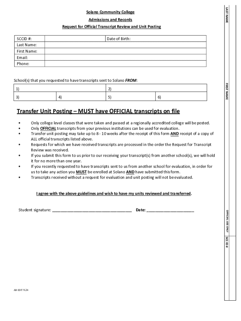 This document is a request form for students at Solano Community College to have their official transcripts reviewed and unit postings processed. It outlines the necessary steps and conditions for