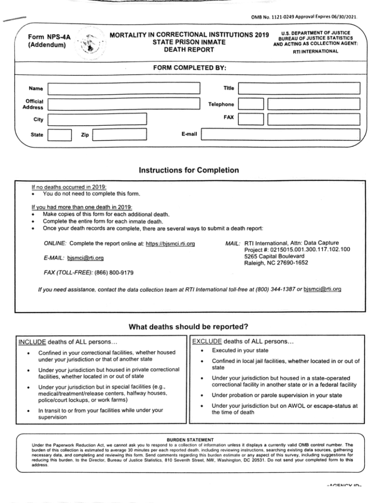 Este formulario debe completarse para cada muerte de recluso en las instituciones correccionales. Proporciona instrucciones sobre cómo reportar las muertes y qué información se debe incluir. Se