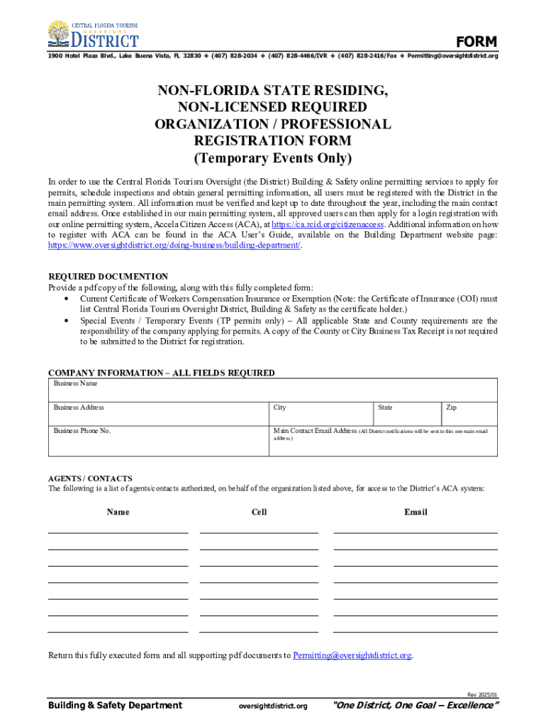 This form is required for non-Florida state residing, non-licensed organizations and professionals to register with the Central Florida Tourism Oversight for temporary events. It outlines the necessary