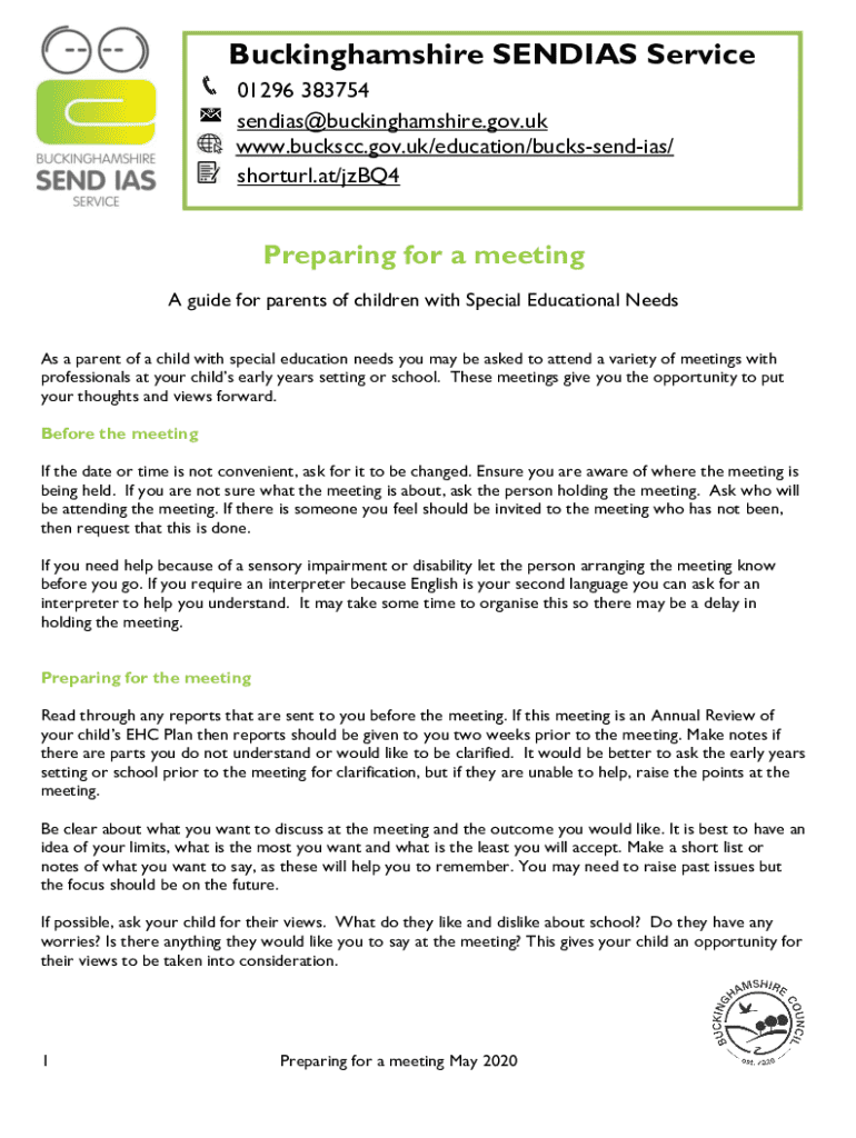 Buckinghamshire SENDIAS Service 01296 383754 sendias@buckinghamshire.gov.uk www.buckscc.gov.uk/education/buckssendias/ shorturl.at/jzBQ4Preparing for a meeting A guide for parents of children with