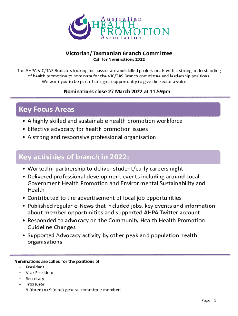 The AHPA VIC/TAS Branch is inviting skilled professionals in health promotion to nominate for various committee positions. This document outlines the nomination process, required skills, and key activities