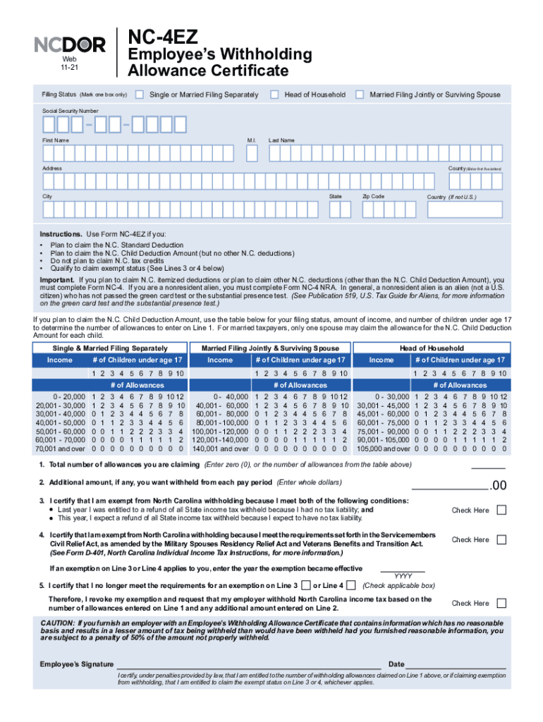 Employees who are residents of North Carolina and have a single job, or meet specific criteria for withholding exemptions, may be required to file NC-4EZ.