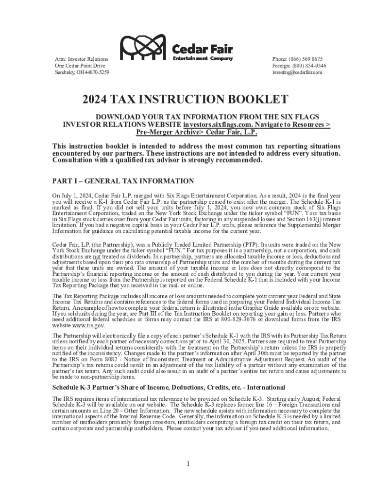 Attn: Investor Relations One Cedar Point Drive Sandusky, OH 448705259Phone: (866) 569 8675 Foreign: (800) 8549346 investing@cedarfair.com2024 TAX INSTRUCTION BOOKLET DOWNLOAD YOUR TAX INFORMATION