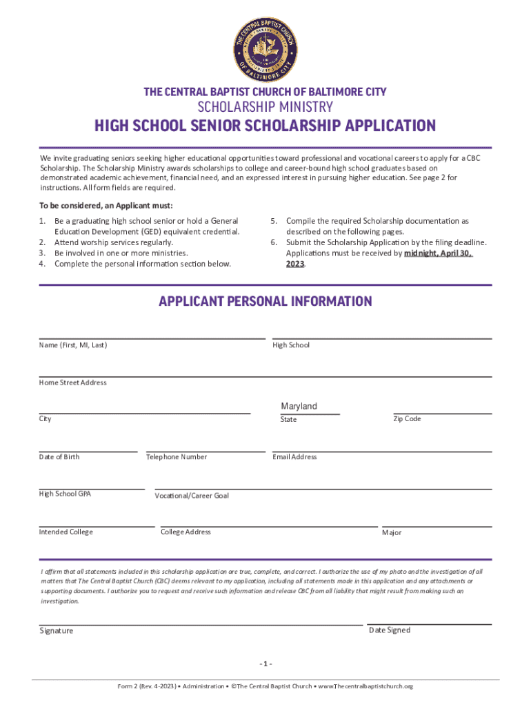 The Central Baptist Church of Baltimore City invites graduating seniors to apply for a scholarship aimed at supporting higher educational opportunities. Scholarships are awarded based on academic