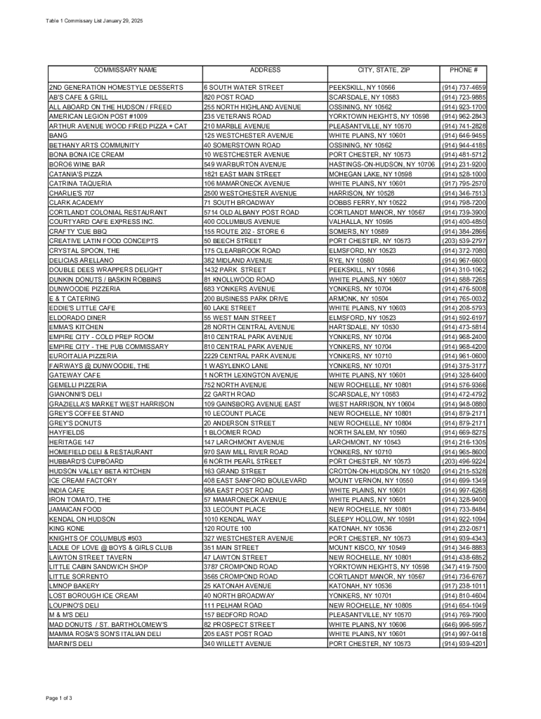 A comprehensive list of various commissaries including their names, addresses, cities, states, ZIP codes, and phone numbers.
