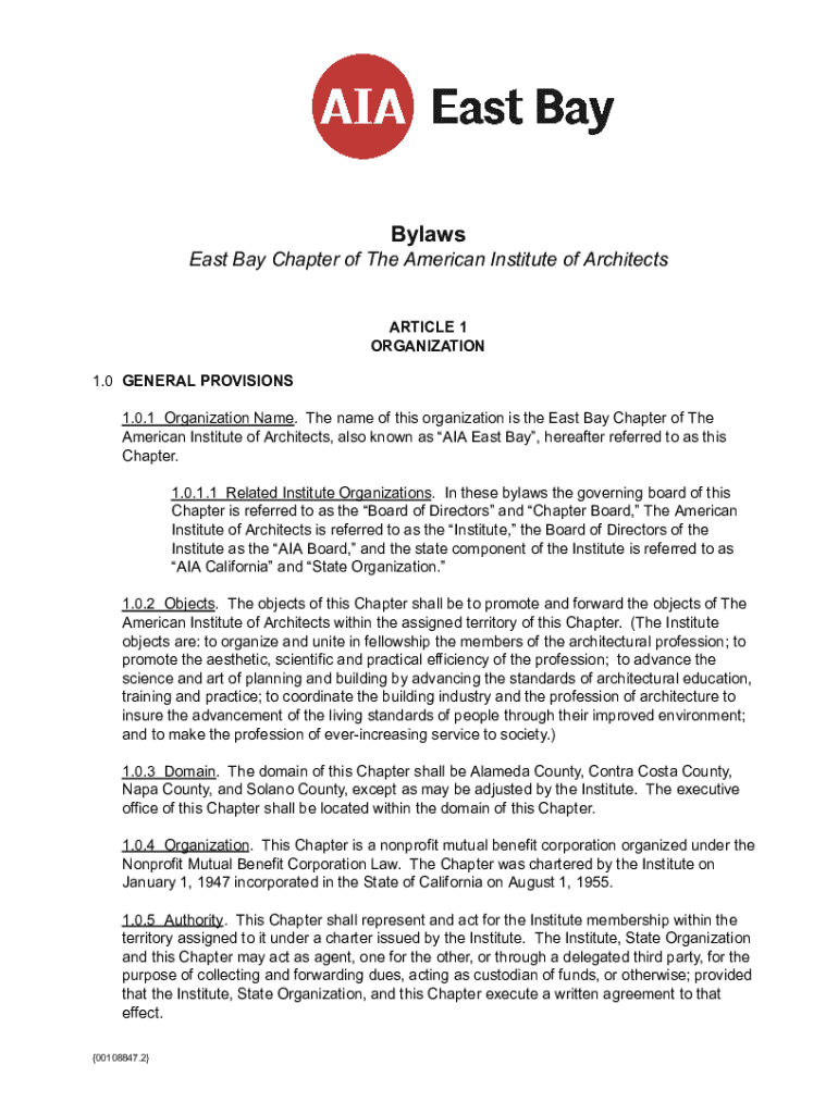 These bylaws establish the governance structure, membership categories, duties of officers, meeting protocols, and financial regulations of the East Bay Chapter of the American Institute of Architects.