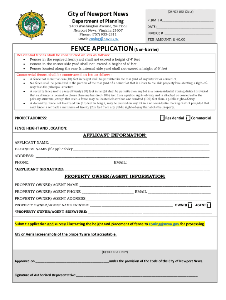 VA Fence Application (Non-Barrier) - City of Newport News 2023-2026 free printable template
