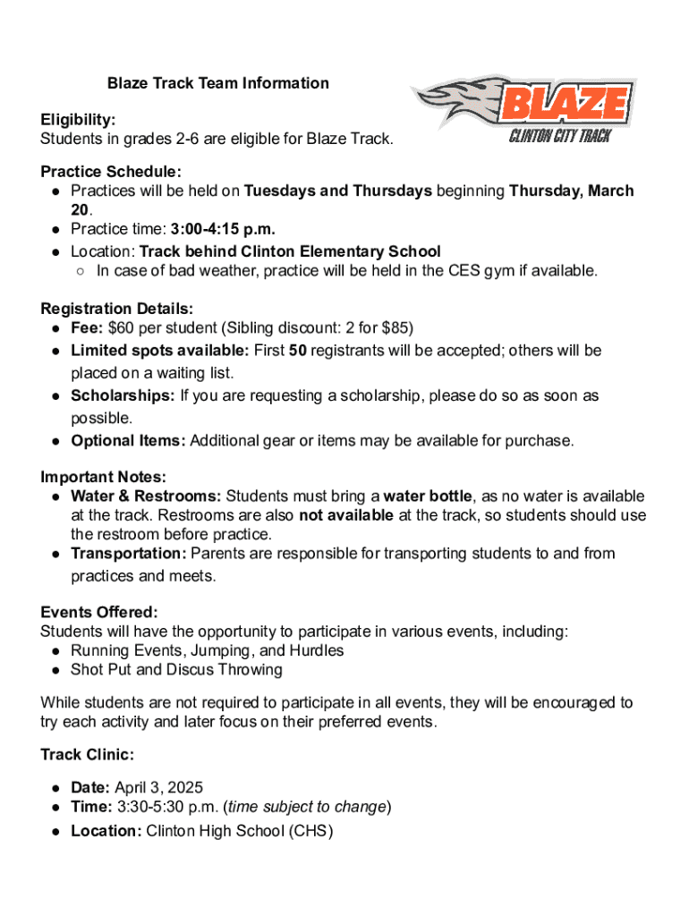 Información sobre el equipo de atletismo Blaze para estudiantes de 2º a 6º grado, incluyendo detalles sobre elegibilidad, horarios de prácticas, tarifas de registro, uniforme y eventos ofrecidos.