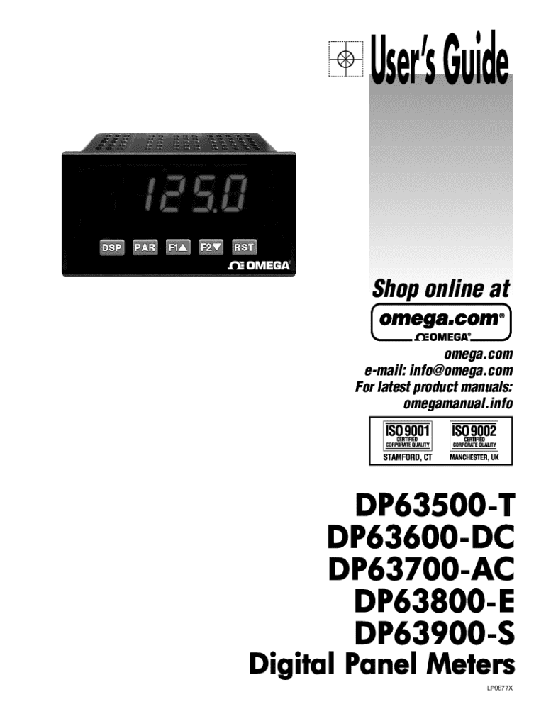 Users GuideShop online at omega.com email: info@omega.com For latest product manuals: omegamanual.infoDP63500T T DP63600D DC DP63700A AC DP63800E E DP63900S SDigital Panel Meters LP0677XOMEGAnet Online