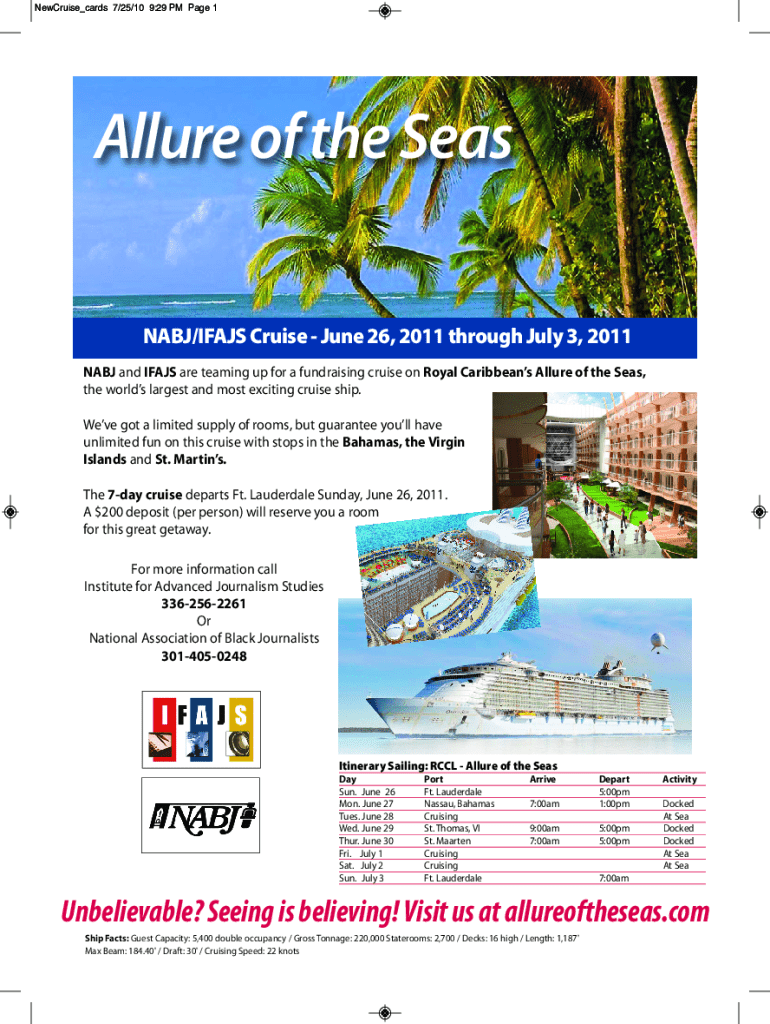 NewCruise_cards 7/25/10 9:29 PM Page 1Allure of the Seas NABJ/IFAJS Cruise June 26, 2011 through July 3, 2011 NABJ and IFAJS are teaming up for a fundraising cruise on Royal Caribbeans Allure of the