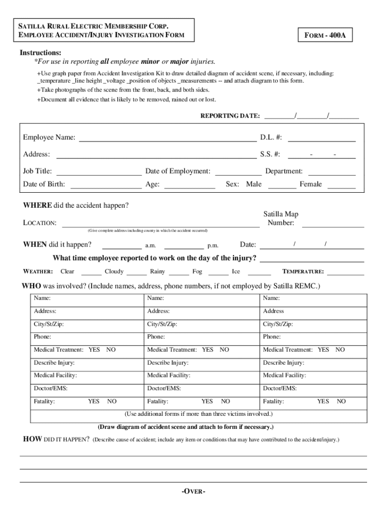 This form is used for reporting all employee minor or major injuries at Satilla Rural Electric Membership Corporation. It includes sections for detailed injury descriptions, witness information, medical
