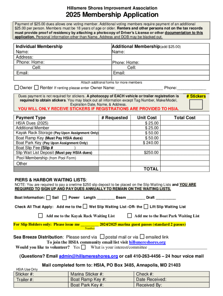 This document is a membership application for the Hillsmere Shores Improvement Association for the year 2025. It includes details regarding dues payment, membership options, requirements for proof