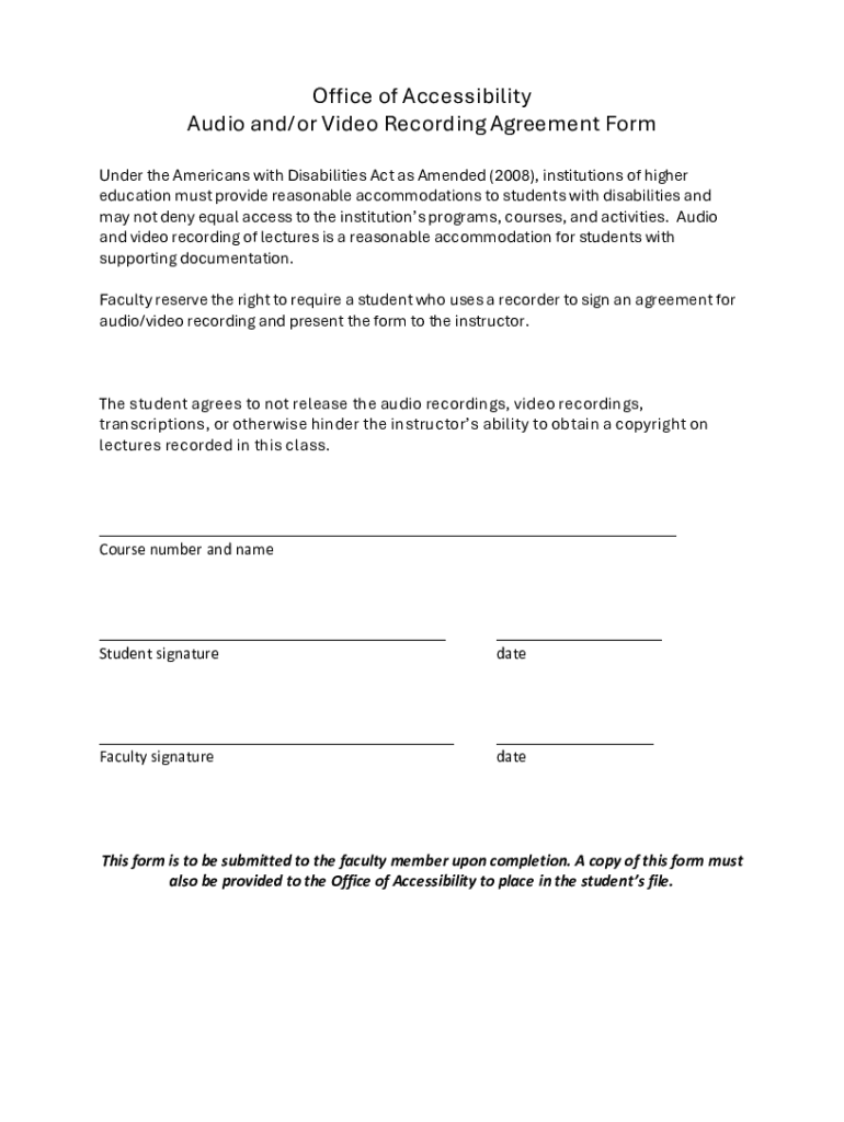 This form is used to document an agreement between students and faculty regarding the audio and video recording of lectures as a reasonable accommodation for students with disabilities under the Americans