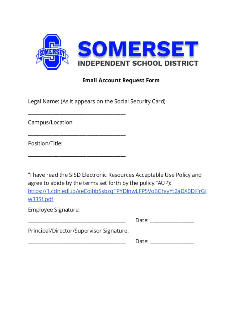 This form is used to request an email account, requiring the legal name, position/title, and signatures from both the employee and supervisor.