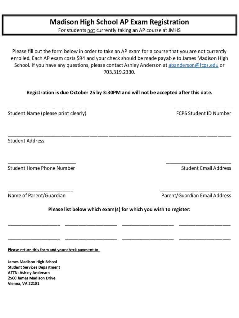 This form is for students not currently taking an AP course at JMHS to register for an AP exam. The registration deadline is October 25 by 3:30 PM. Each exam costs $94, and checks should be made payable