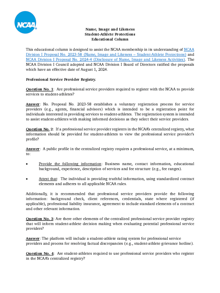 This educational column is designed to assist the NCAA membership in its understanding of NCAA Division I Proposal No. 2023-58 and NCAA Division I Proposal No. 2024-4, which pertain to student-athlete