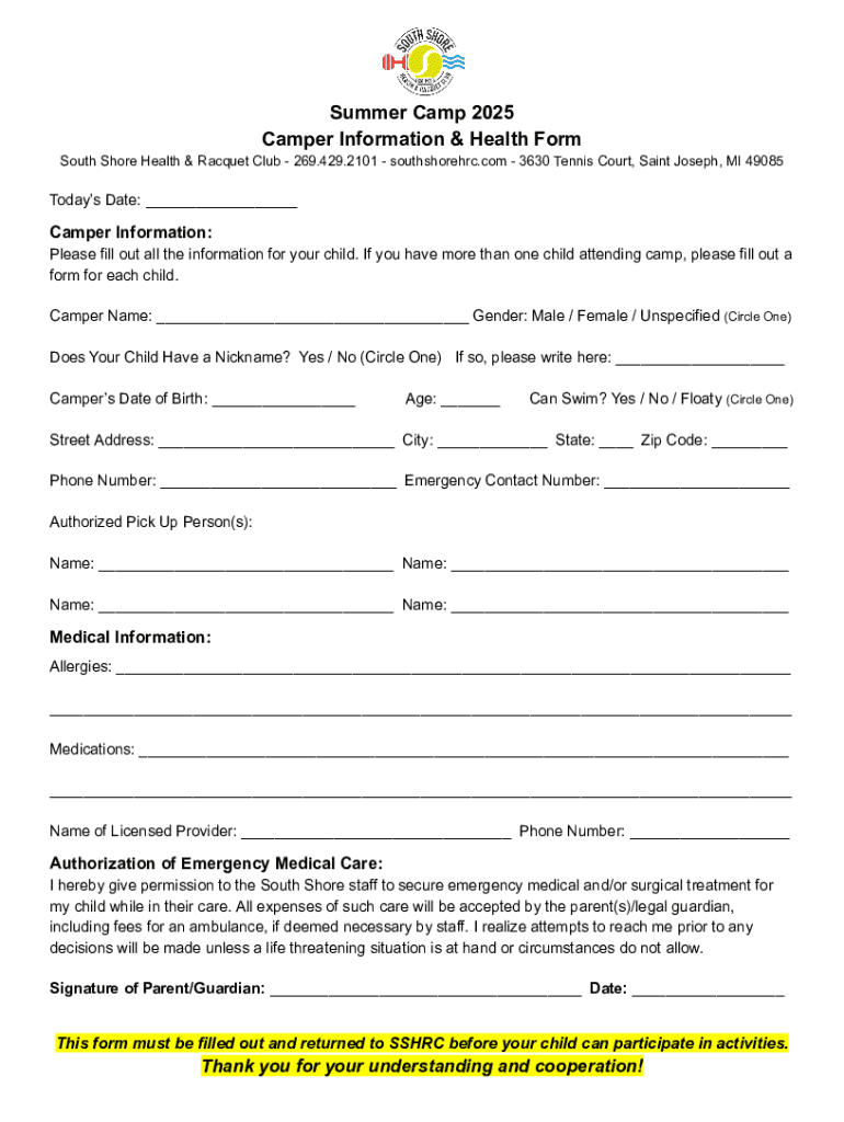 Typically, all campers and their guardians are required to file the camper information health form before attending the camp, especially if there are specific health needs or medications.
