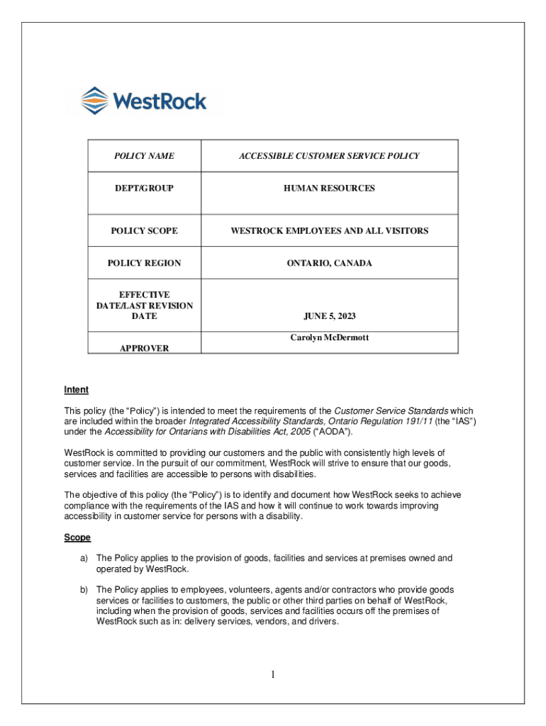 This policy outlines WestRock\'s commitment to providing accessible customer service in accordance with the Accessibility for Ontarians with Disabilities Act, 2005. It details the scope of the policy,