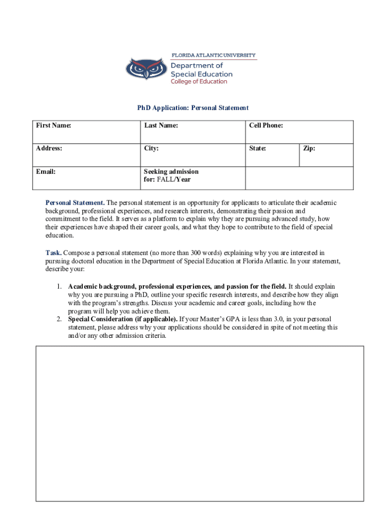This document is a personal statement for applicants seeking admission to the PhD program in Special Education at Florida Atlantic. It allows candidates to outline their academic and professional