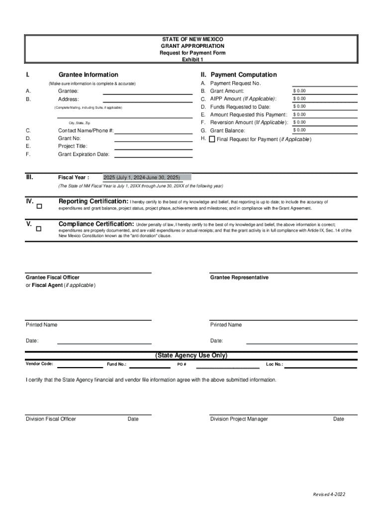 Este formulario es utilizado para solicitar el pago de fondos relacionados con un proyecto financiado por una subvención en el estado de Nuevo México. Incluye información del beneficiario, cálculo