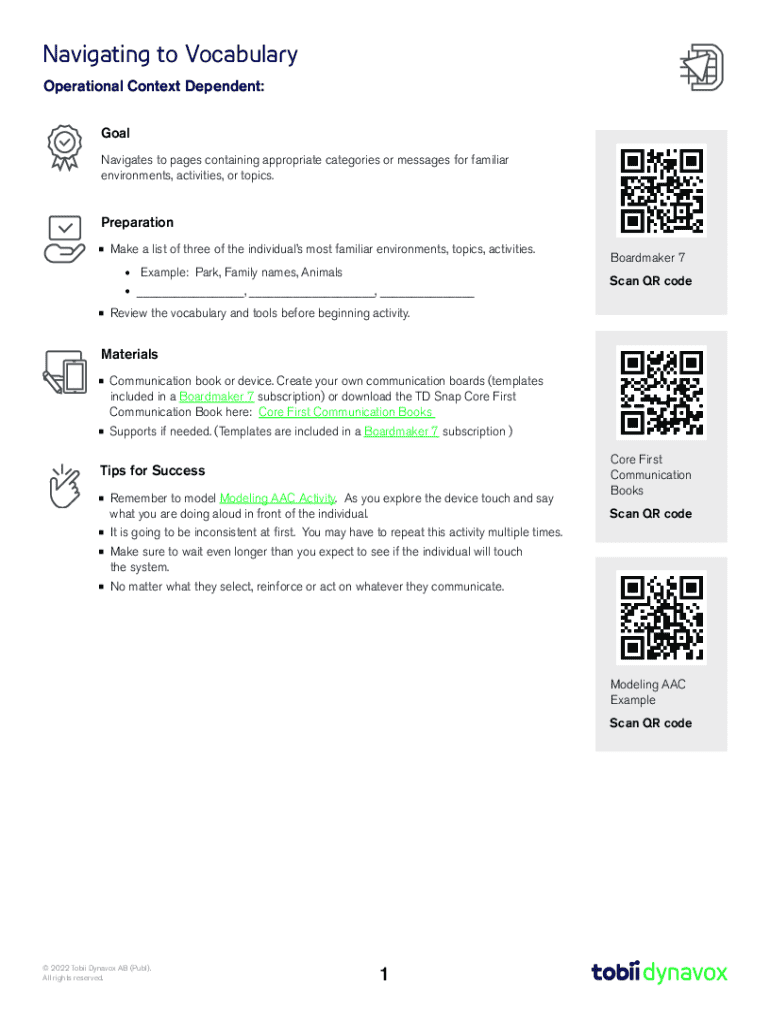 Navigating to Vocabulary Operational Context Dependent: Goal Navigates to pages containing appropriate categories or messages for familiar environments, activities, or topics.Preparation Make a list