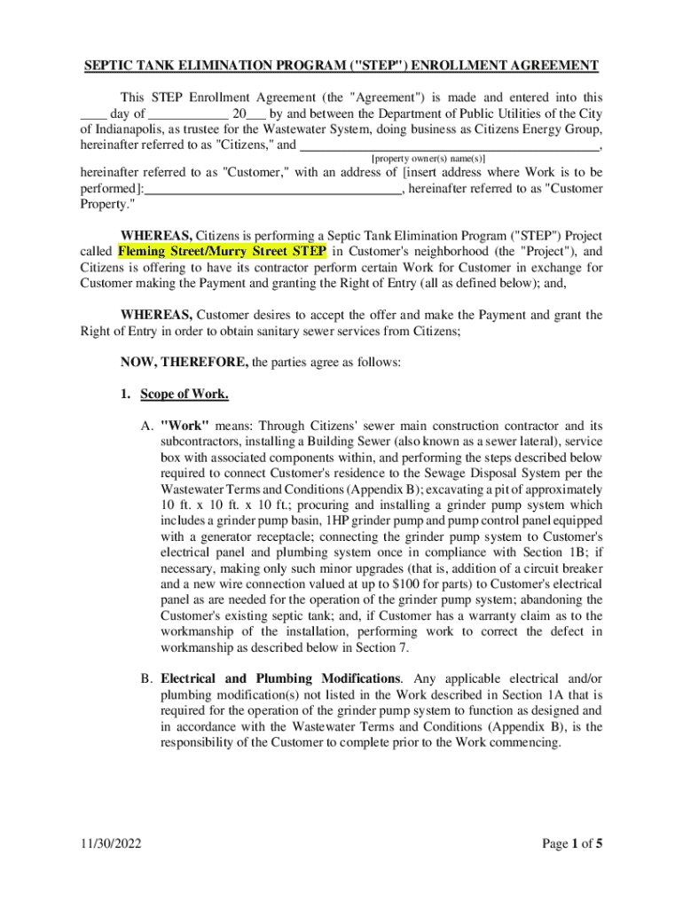 This Enrollment Agreement details the terms and conditions under which Citizens Energy Group will perform work to connect properties currently using septic systems to the sanitary sewer system. It