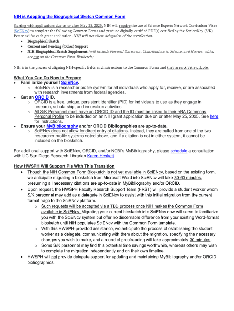NIH is Adopting the Biographical Sketch Common Form Starting with applications due on or after May 25, 2025, NIH will require the use of Science Experts Network Curriculum Vitae (SciENcv) to complete