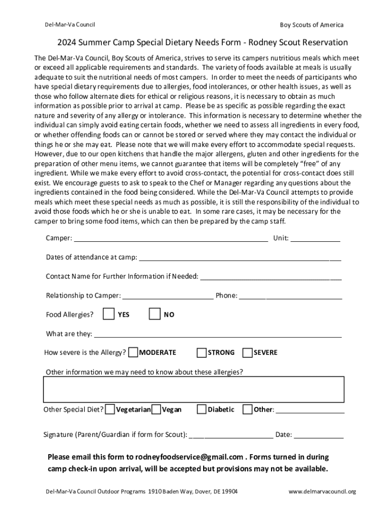 Form to collect dietary requirements for campers with allergies, intolerances, or special diets at the Del-Mar-Va Council\'s Rodney Scout Reservation.
