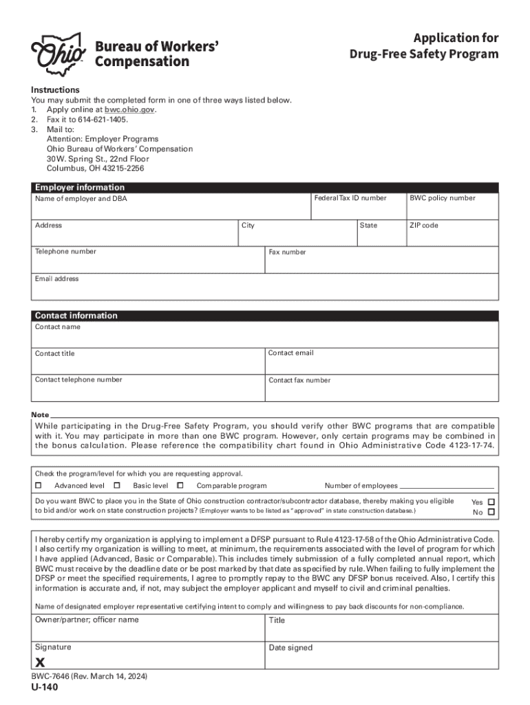This document is an application form for employers seeking to enroll in the Drug-Free Safety Program offered by the Ohio Bureau of Workers’ Compensation. It includes instructions on how to submit