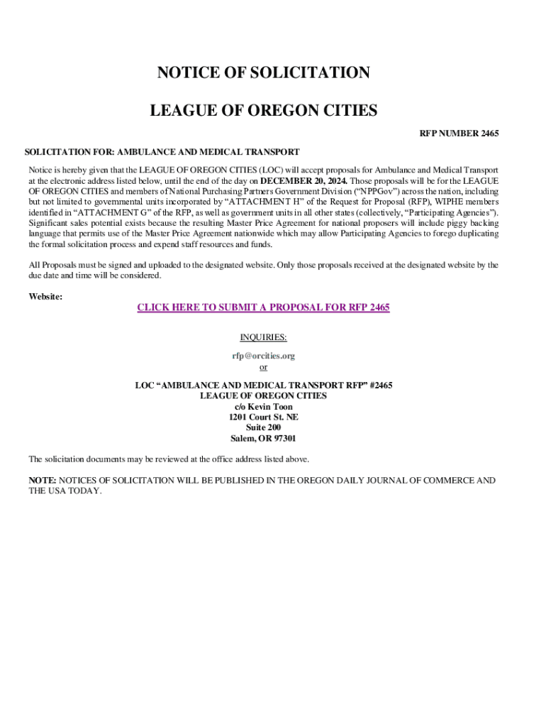 Este documento es una notificación de la Liga de Ciudades de Oregón (LOC) que acepta propuestas para Ambulancia y Transporte Médico hasta el 20 de diciembre de 2024. Se busca establecer un Acuerdo