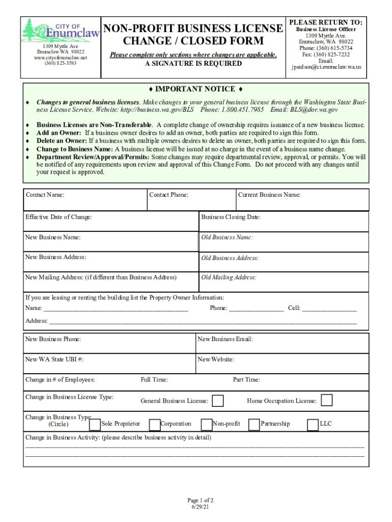 This form is used for making changes to a non-profit business license in Enumclaw, WA, including adding or deleting owners, changing business names and addresses, and providing emergency contact information.