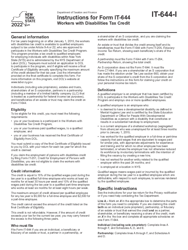 Instructions for Form IT-644 regarding the Workers with Disabilities Tax Credit for qualified employers in New York State, including eligibility criteria, credit amounts, and filing instructions.