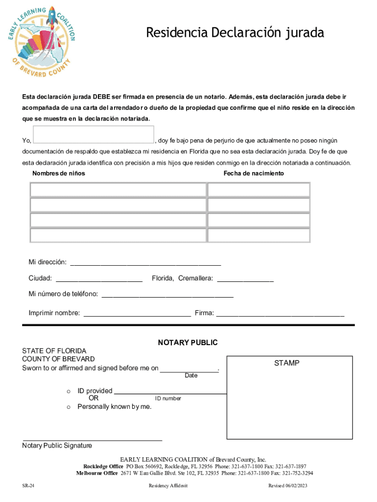 Esta declaración jurada certifica la residencia de un niño en una dirección específica en Florida y debe ser firmada ante un notario. Incluye detalles sobre los niños que residen en la dirección