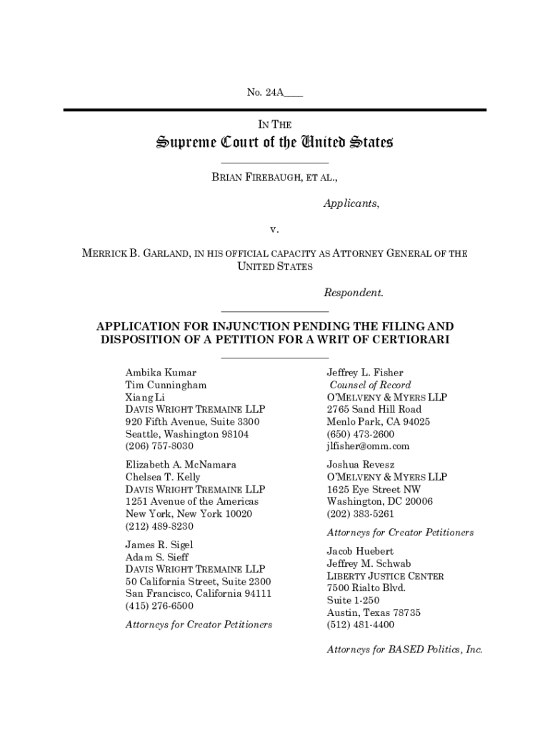 This document is an application submitted to the Supreme Court of the United States by Brian Firebaugh and others, seeking an injunction pending the filing and disposition of a petition for a writ