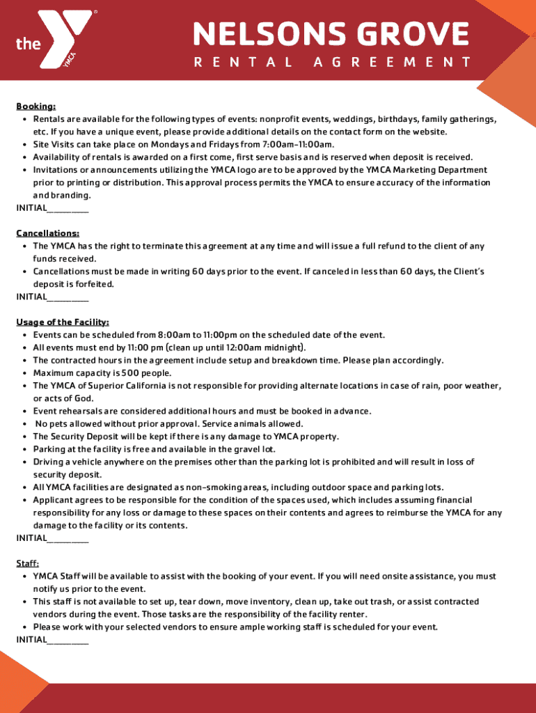 This rental agreement outlines the terms and conditions for renting Nelson\'s Grove for various events, including booking details, cancellation policies, facility usage, staff responsibilities, equipment,