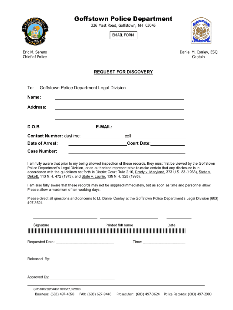 This document is a request form for individuals seeking to inspect records held by the Goffstown Police Department\'s Legal Division. It requires the requester\'s personal information, case details,