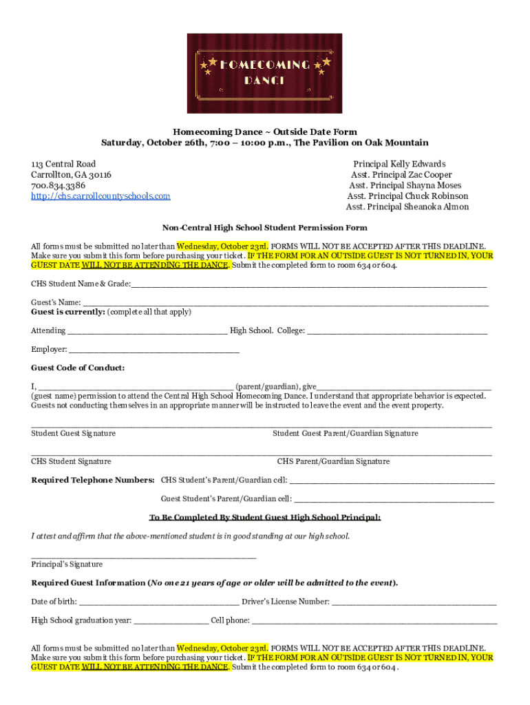 Este formulario es necesario para que los estudiantes de la Escuela Secundaria Central traigan a un invitado externo al baile de regreso a casa. Debe ser completado y entregado antes de la fecha límite