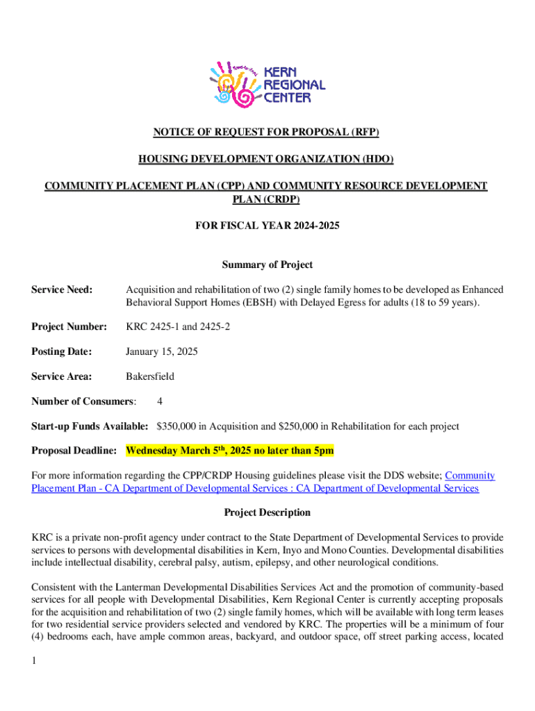 This document outlines the Request for Proposal for the acquisition and rehabilitation of two single-family homes to be developed as Enhanced Behavioral Support Homes for adults with developmental