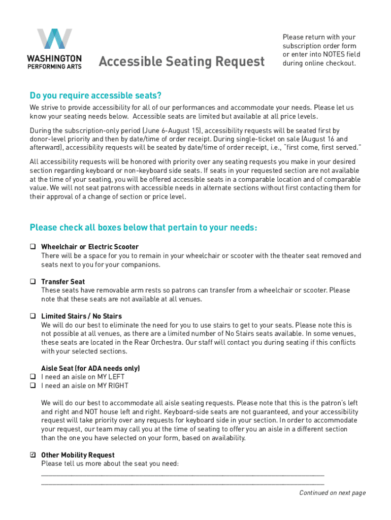 This form is designed to assist patrons who require accessible seating for performances. It allows individuals to specify their seating needs, including wheelchair and scooter accommodations, aisle
