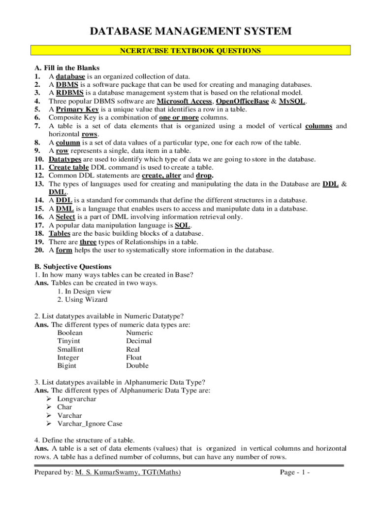 DATABASE MANAGEMENT SYSTEM NCERT/CBSE TEXTBOOK QUESTIONS A. Fill in the Blanks 1. A database is an organized collection of data. 2. A DBMS is a software package that can be used for creating and managing