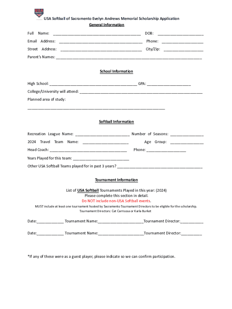 The USA Softball of Sacramento Evelyn Andrews Memorial Scholarship aims to assist student-athletes who have participated in local softball tournaments. This scholarship honors Evelyn Andrews, a dedicated