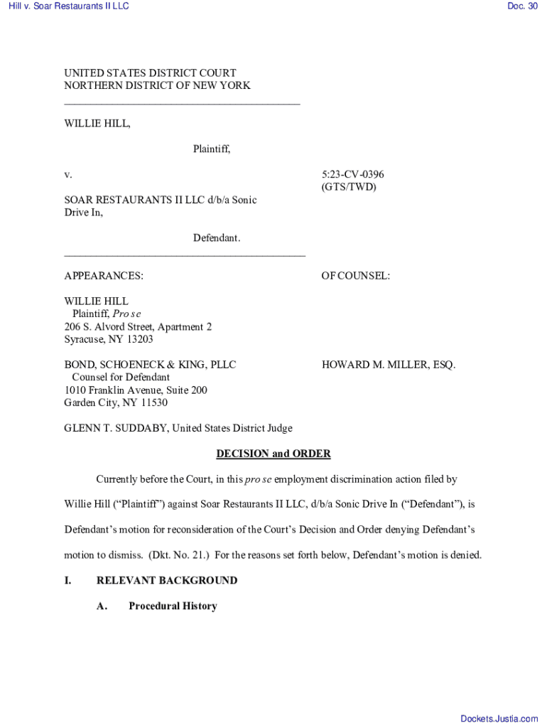 Hill v. Soar Restaurants II LLCDoc. 30UNITED STATES DISTRICT COURT NORTHERN DISTRICT OF NEW YORK ___ WILLIE HILL, Plaintiff, v. SOAR RESTAURANTS II LLC d/b/a Sonic Drive In,5:23CV0396 (GTS/TWD)Defendant.