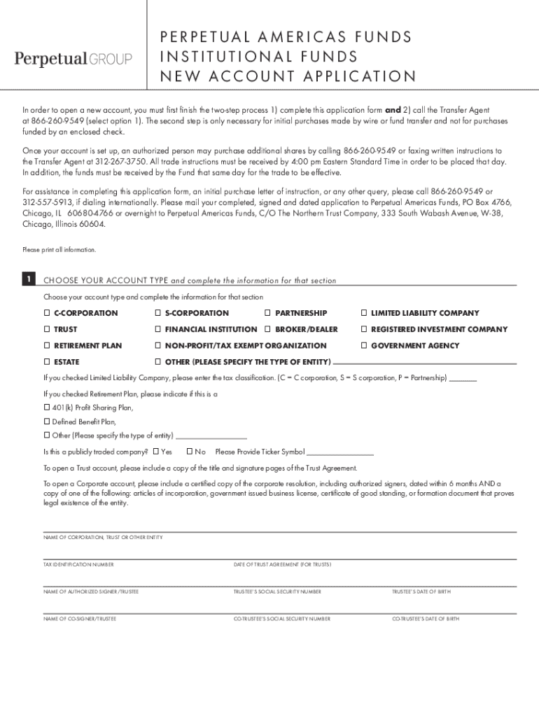 This document is used to apply for a new account with Perpetual Americas Funds, detailing the necessary steps to complete the application, types of accounts available, required information, and contact