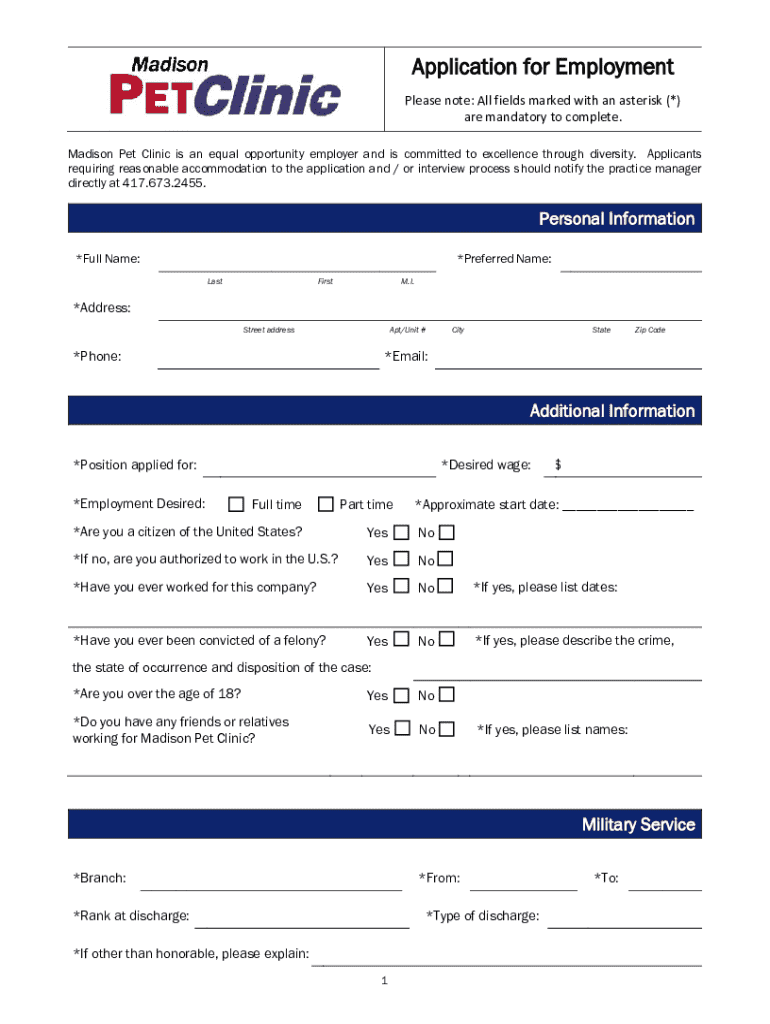 Application form for potential employees at Madison Pet Clinic, requiring personal information, employment history, education, and references.