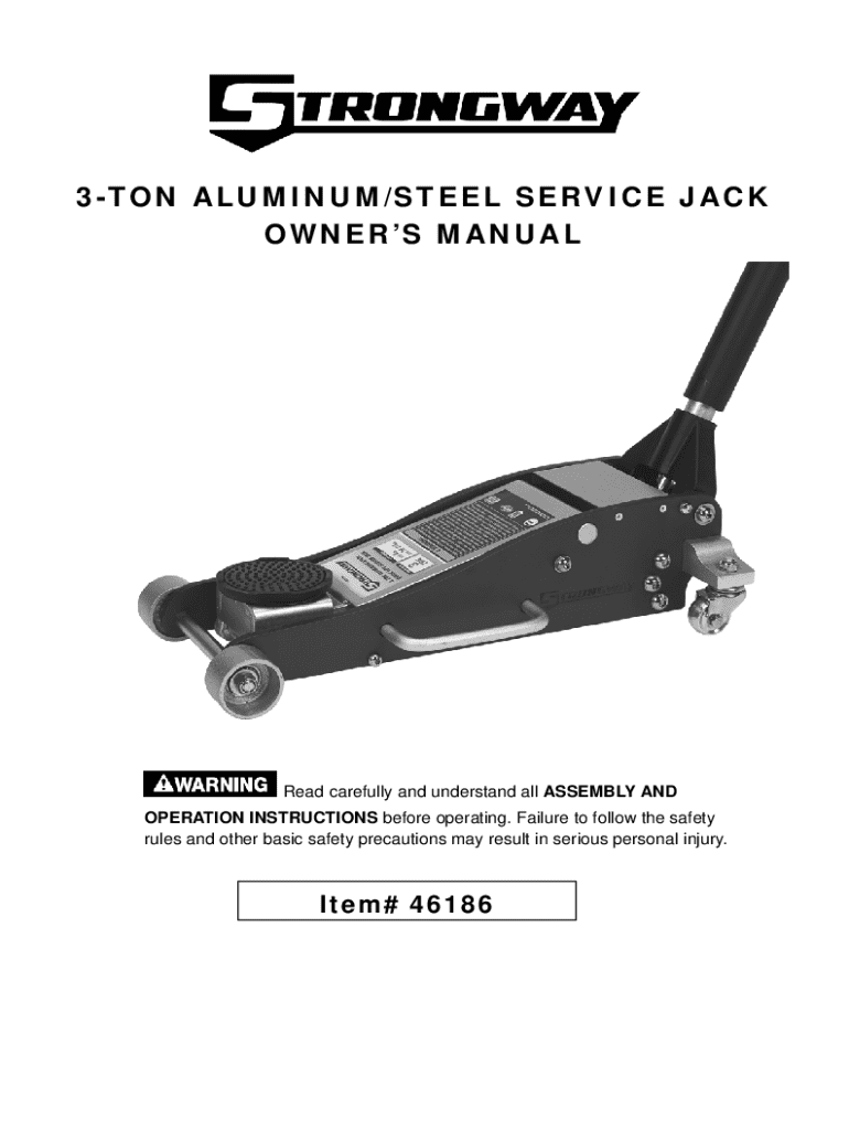 This manual provides important assembly and operation instructions for the Strongway 3-ton aluminum/steel service jack. It emphasizes safety precautions, intended use, technical specifications, and